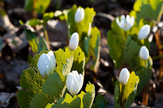 Il y a d'abord la sanguinaire du Canada (sanguinaria canadensis). Les colons l'appelaient «sang-dragon», qui doit son nom au latex de couleur rouge que renferme son rhizome. On peut frotter le rhizome sur notre corps afin de repousser les insectes. Les amérindiens l'utilisaient pour fabriquer leur teinture rouge. Le frère Marie-Victorin a écrit à son sujet que «les fleurs sont étalées horizontalement le matin, mais dans l'après-midi, les pétales se redressent pour se refermer le soir.» Il est important de savoir que cette plante est considérée comme vulnérable au Québec.